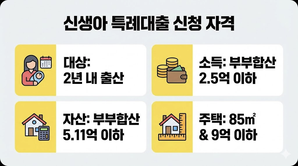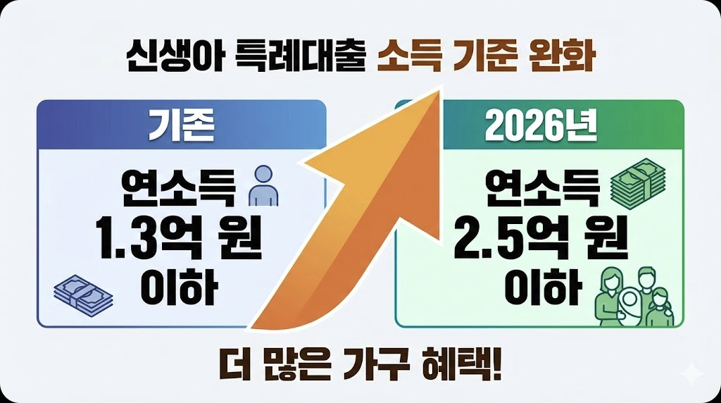 - 소득 기준: 부부 합산 연소득 2.5억 원 이하 (2026년 기준, 3년 한시 적용). 기존 1.3억 원에서 대폭 완화되어 맞벌이 고소득 부부도 혜택을 받을 수 있습니다.