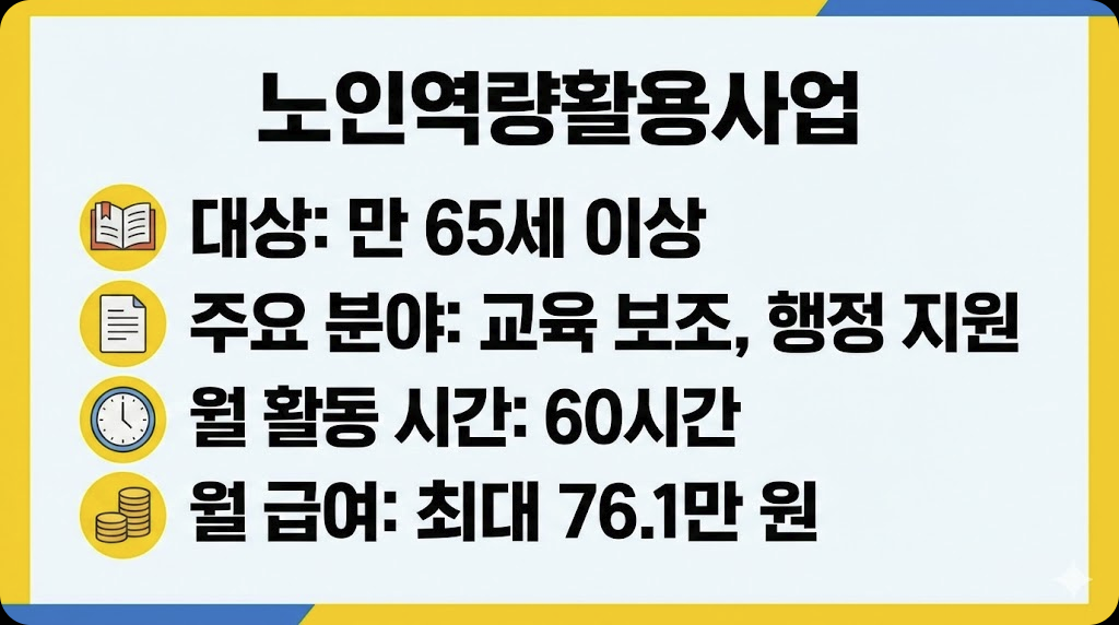 - 내용: 참여자의 경력과 역량을 활용하여 사회적으로 필요한 서비스 (교육 시설 학습 보조 지원, 공공행정 업무지원 등)를 제공합니다.