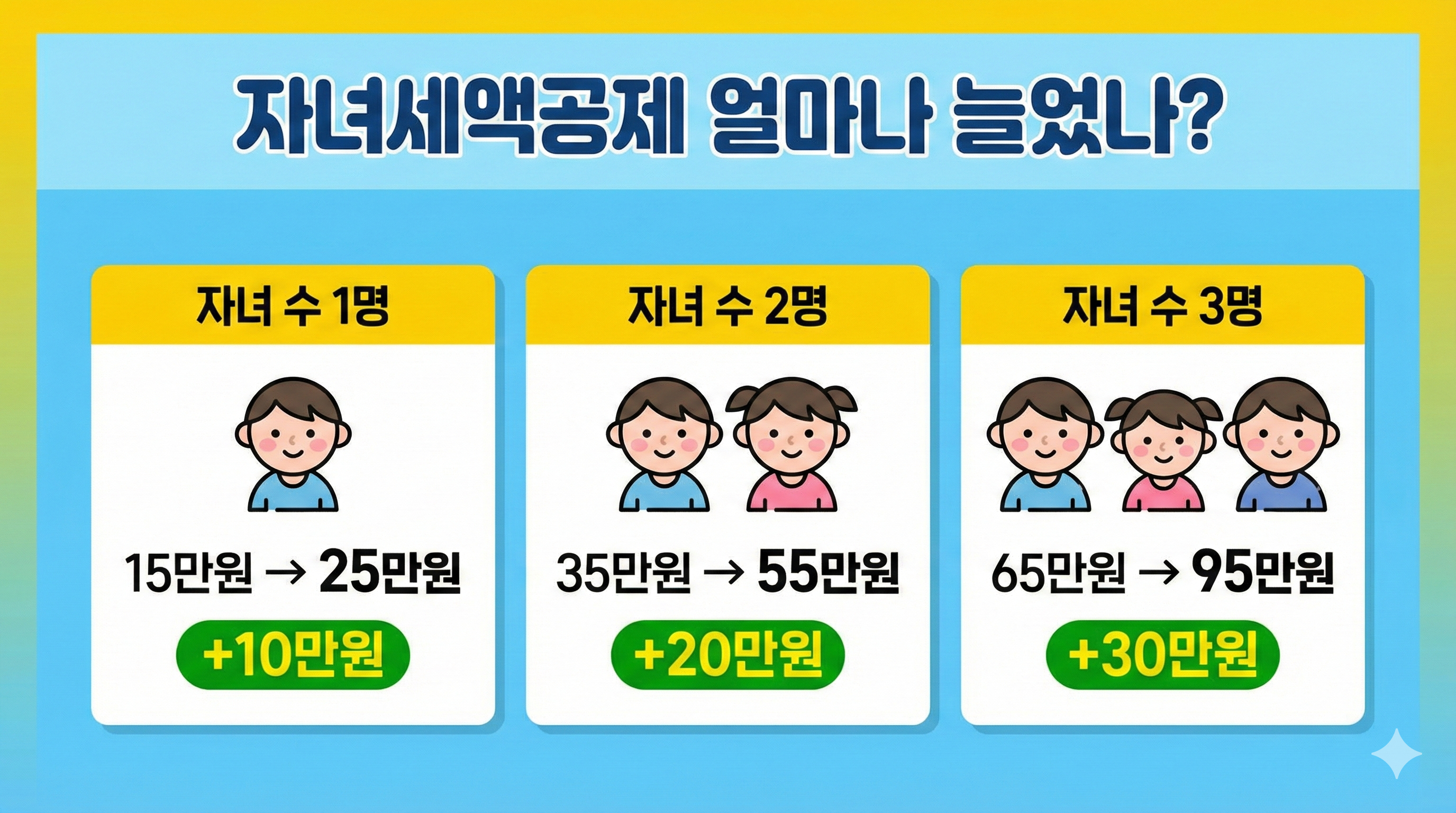 2025년 귀속분부터 자녀세액공제가 1명당 10만원씩 올랐어요!
