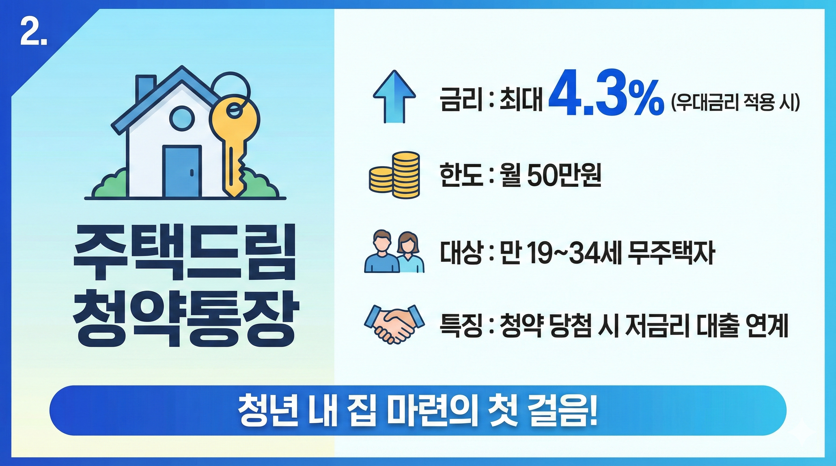 - 청년 주택드림 청약통장: 최대 연 4.5% 금리 + 청약 가점