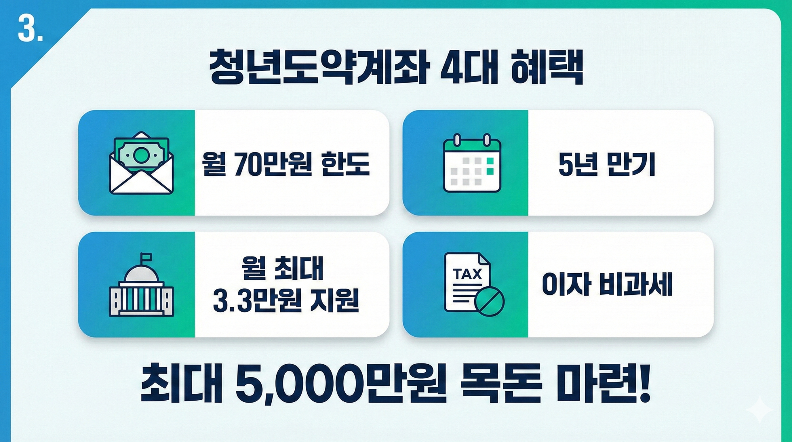 - 청년도약계좌: 5년 만기, 월 70만원, 최대 5,000만원