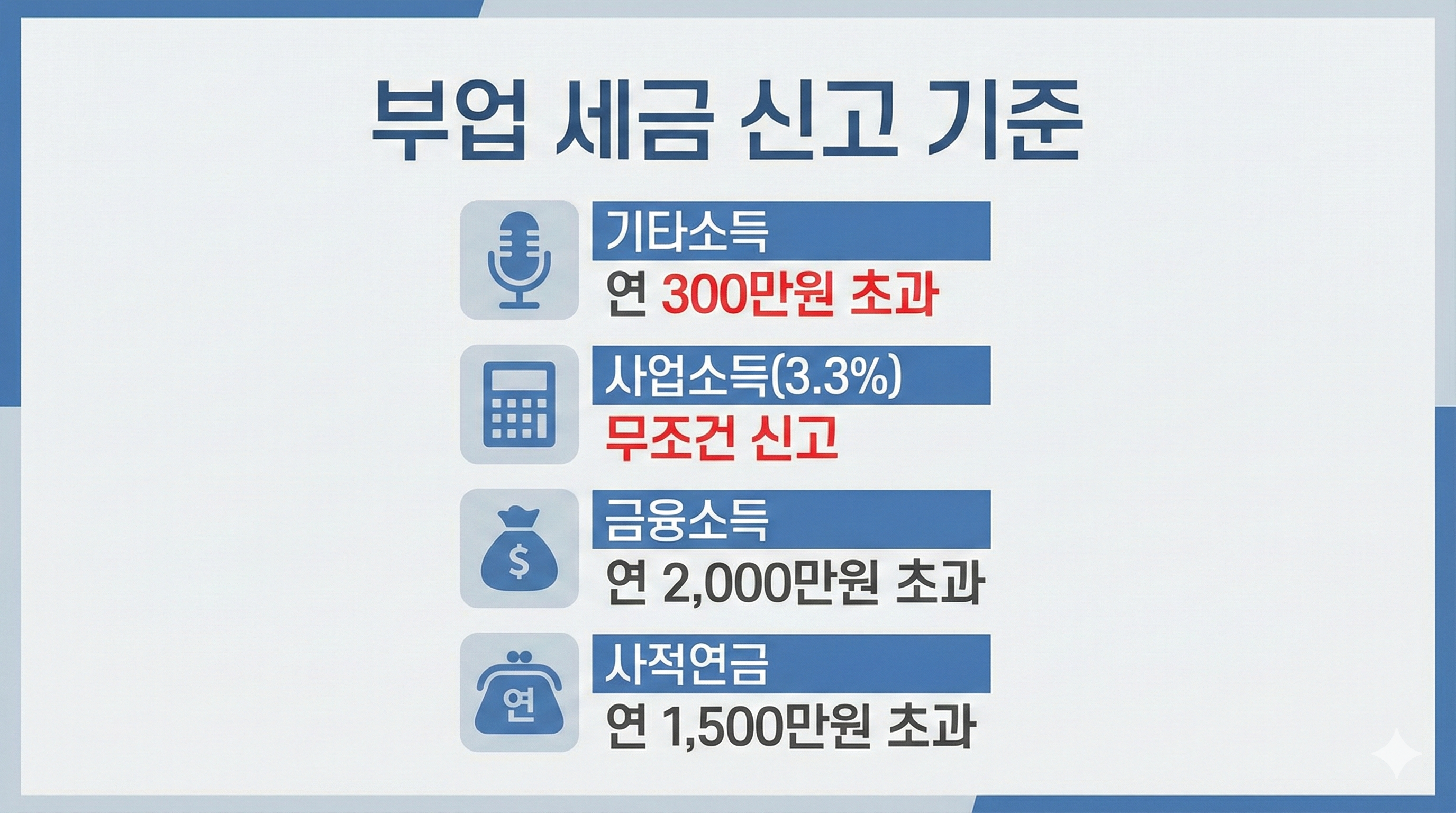 - 부업 소득 연 300만원 초과 → 종합소득세 신고 필수