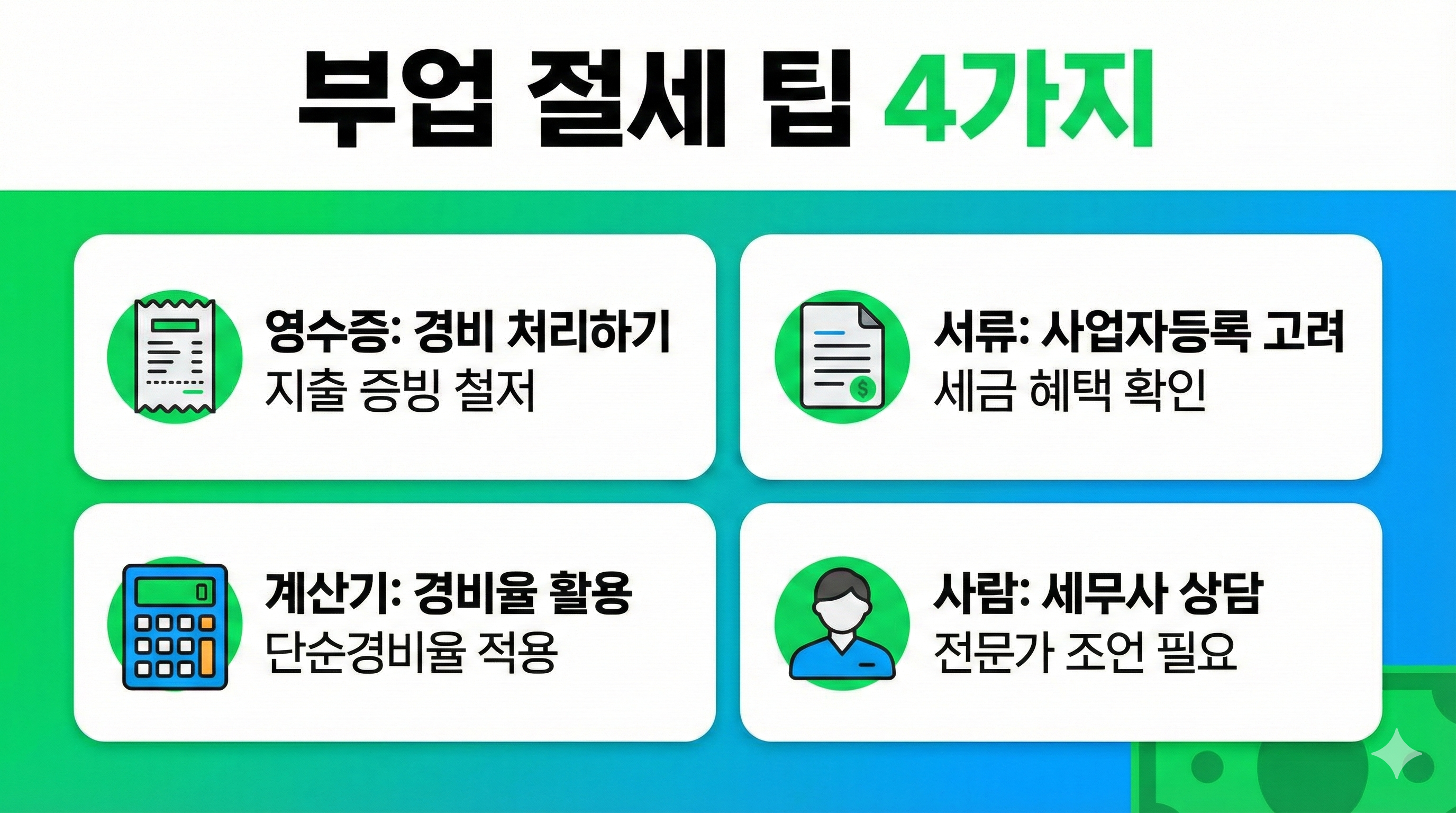 절세 팁! 부업 관련 비용(재료비, 통신비, 장비 구입비 등)을 경비로 처리하면 과세표준을 낮출 수 있어요.