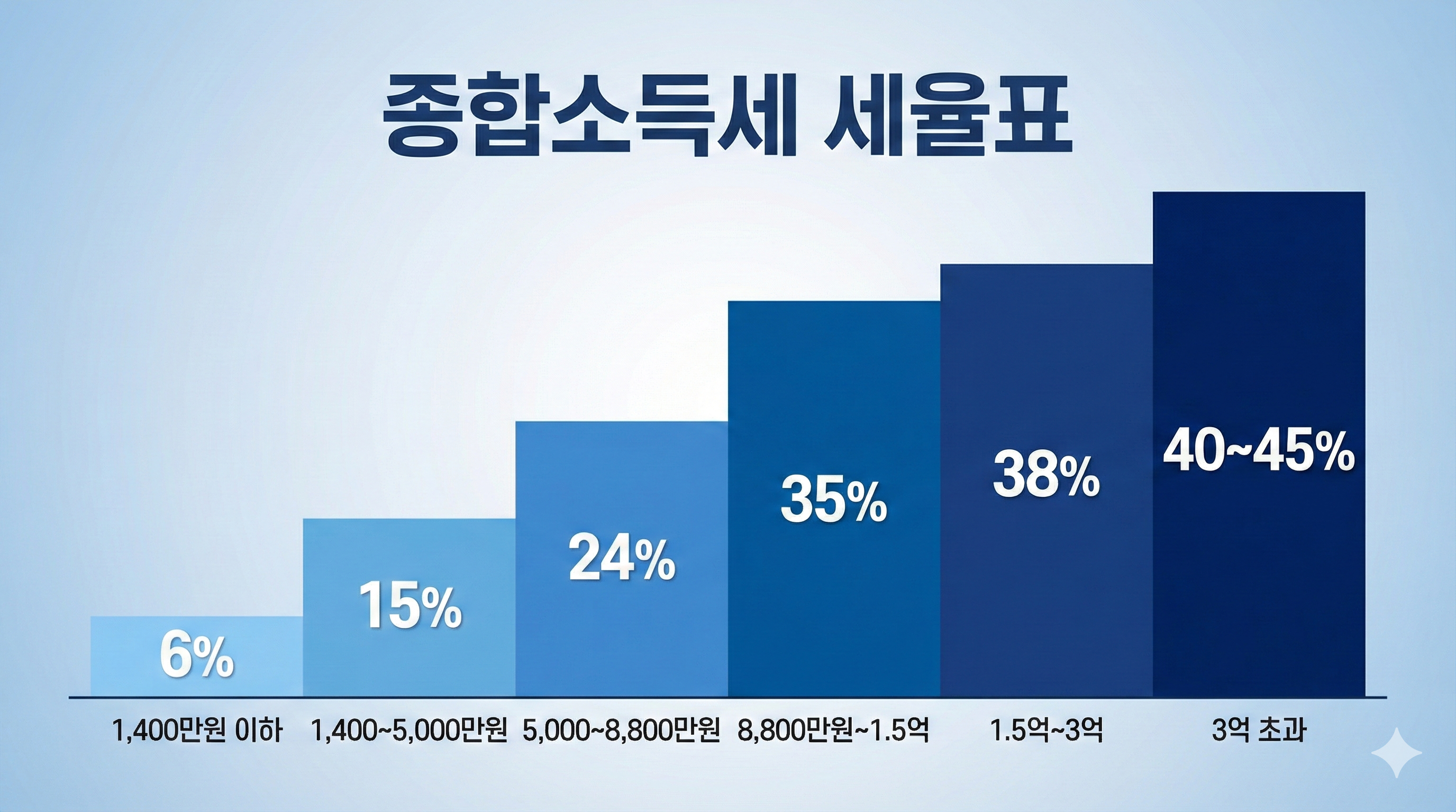 소득이 높아질수록 세율도 올라가는 누진세 방식입니다.