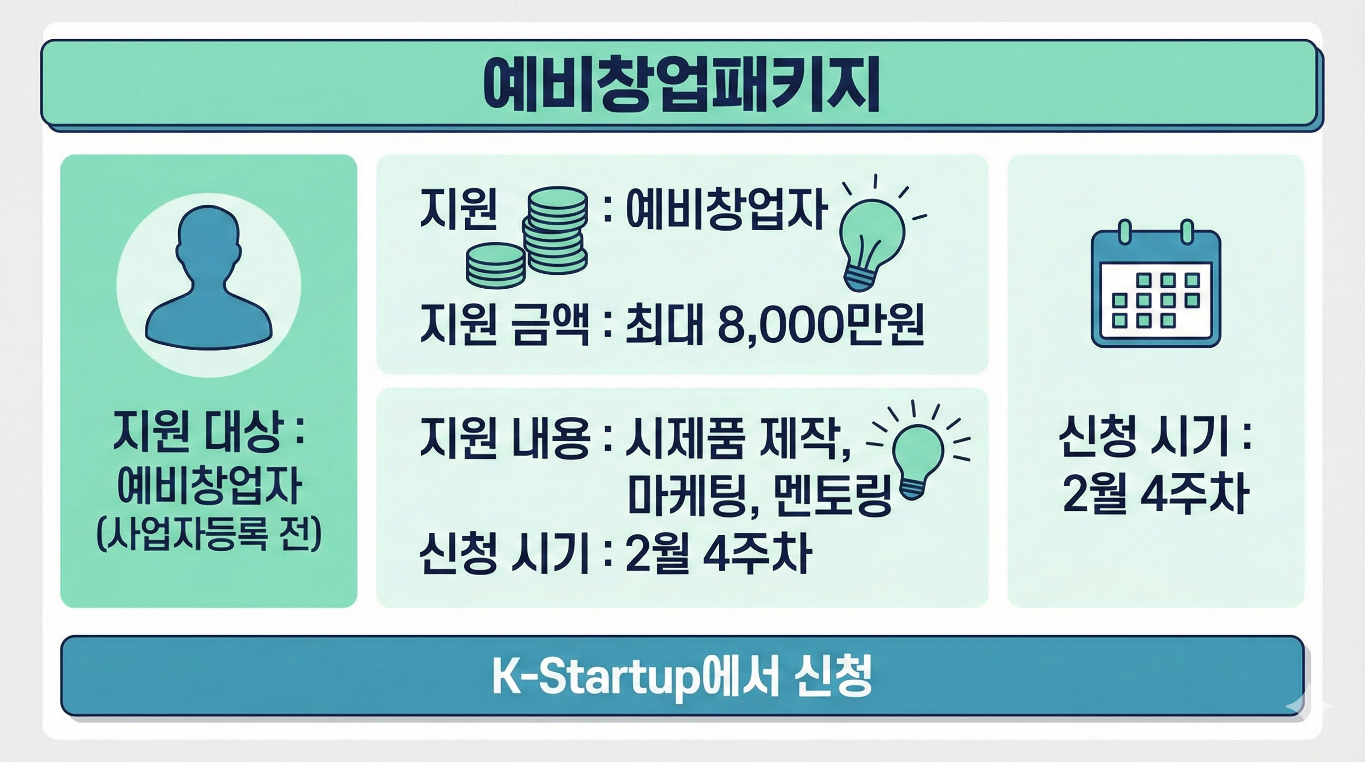 - 예비창업패키지: 예비창업자 대상, 최대 8,000만원