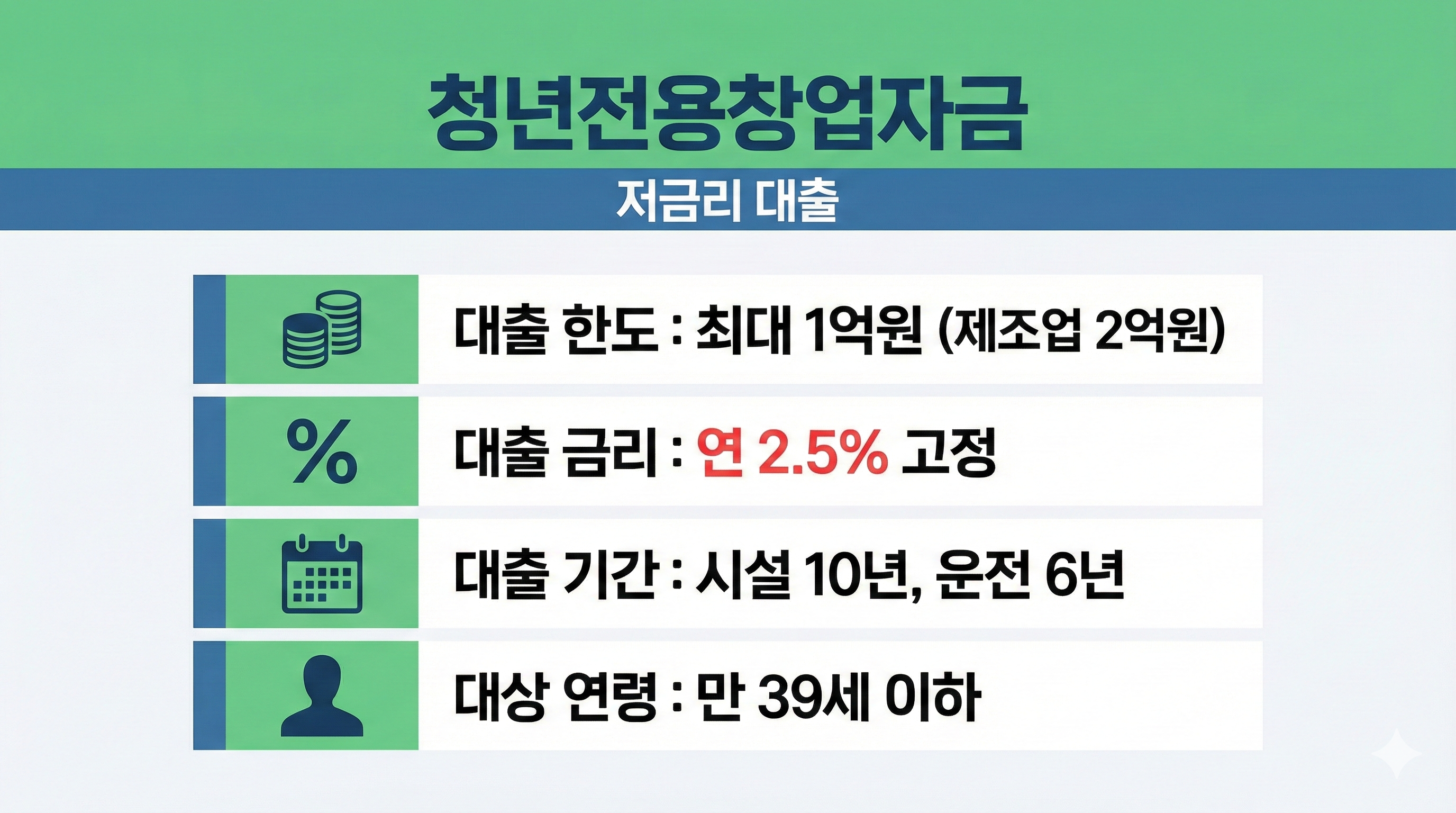 - 청년전용창업자금: 저금리 대출, 최대 2억원
