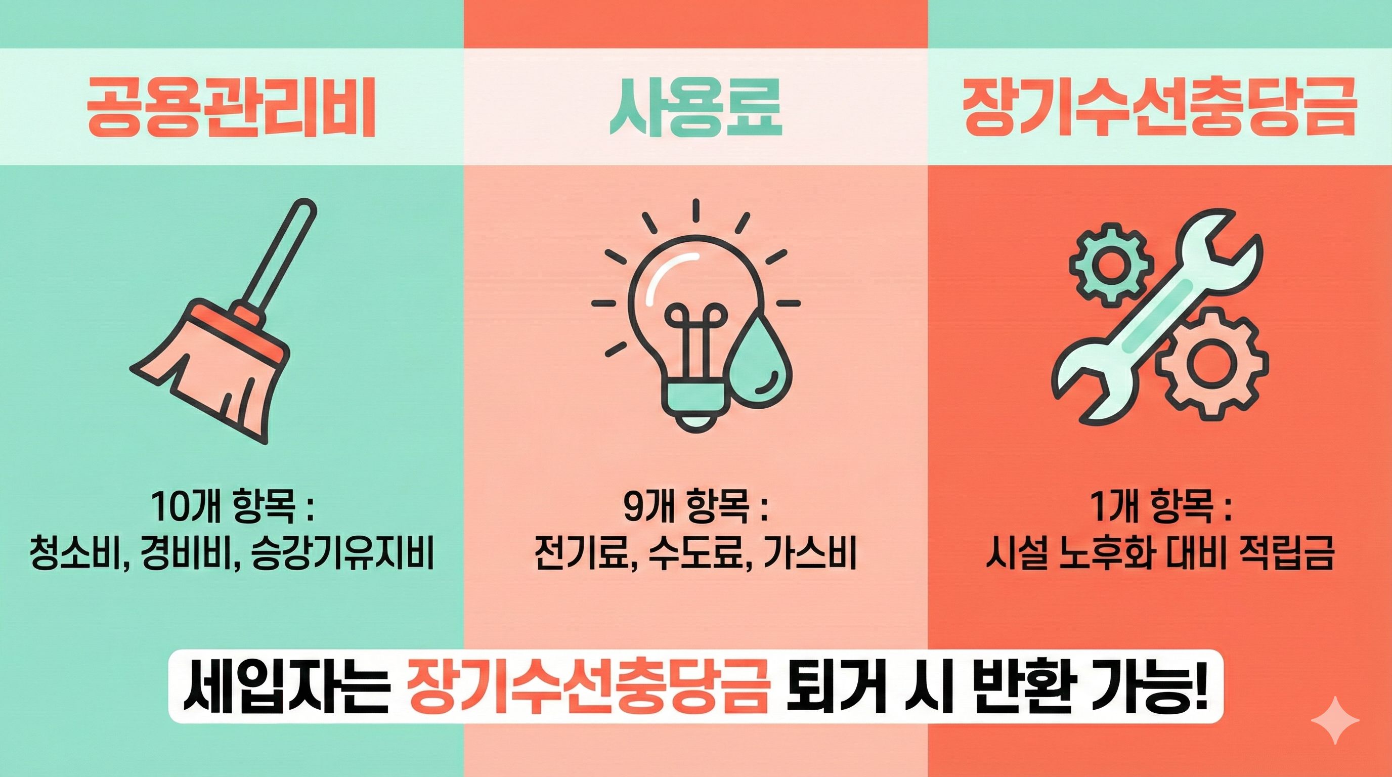 장기수선충당금은 외벽 도색, 승강기 교체 등을 대비한 적립금이에요.