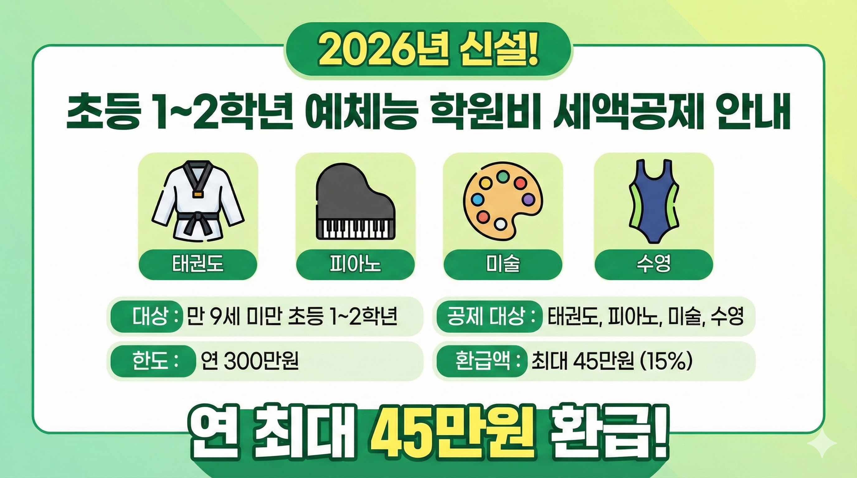 | 예체능 학원비 세액공제 | 초1~2 예체능 | 연 최대 45만원 환급 |