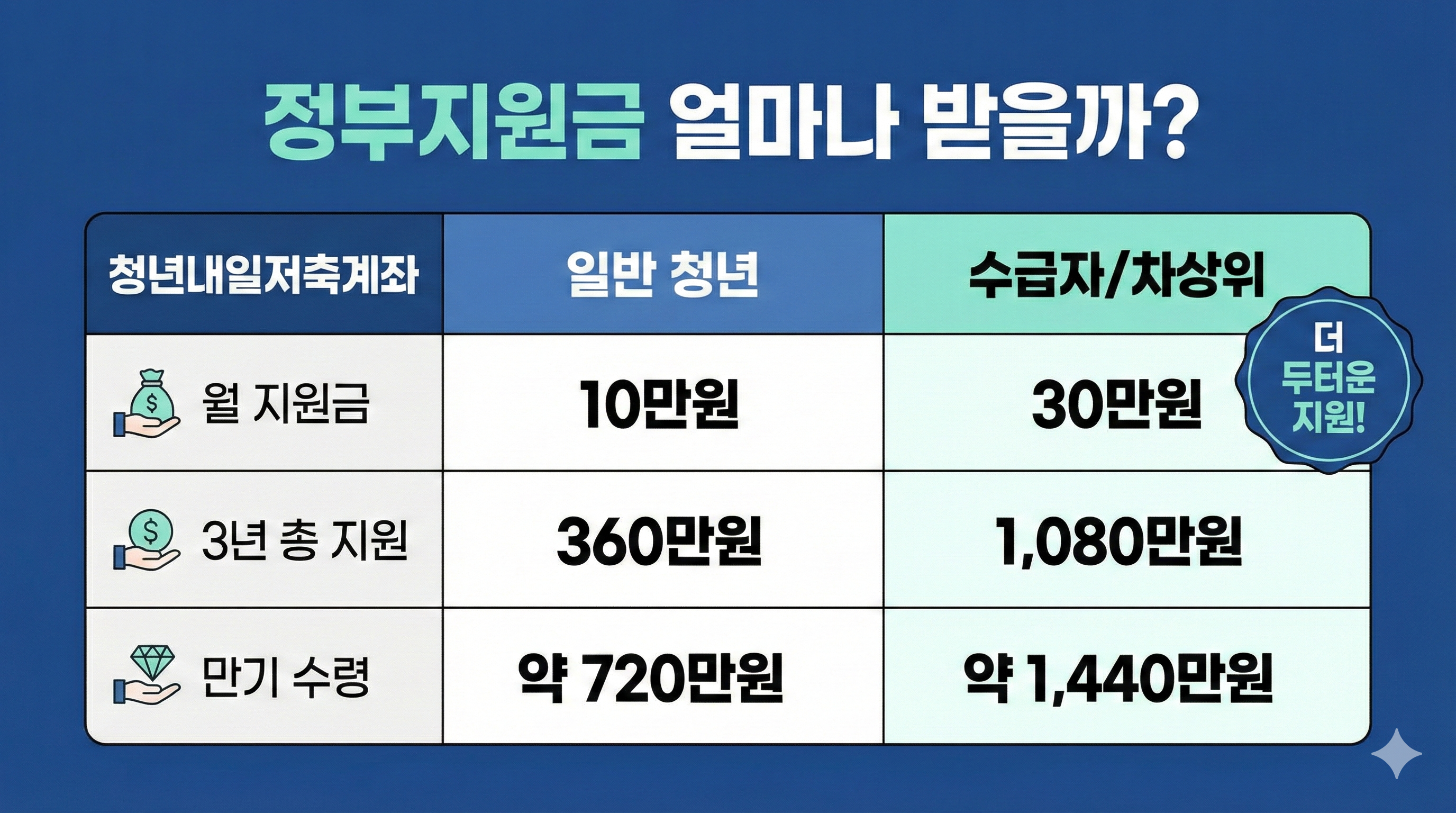 - 정부지원: 월 10~30만원 (3년간 최대 1,080만원)