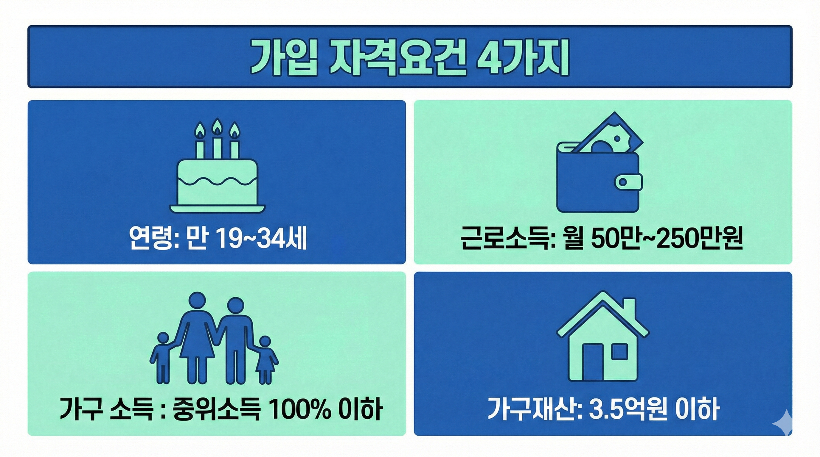 청년내일저축계좌는 4가지 조건을 모두 충족해야 가입할 수 있어요.
