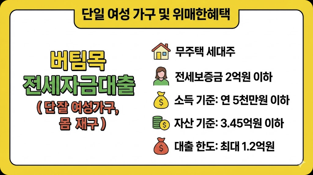 - 자산 기준: 대출 신청인(배우자 포함)의 합산 순자산가액 3.45억원 이하 (2026년 기준)